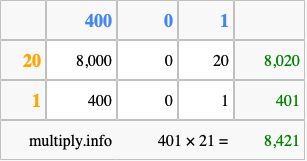 That's all there is to it! As you can see from the box above, the answer to 401 times 21 using the box method is 8,421.