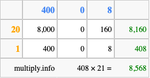 That's all there is to it! As you can see from the box above, the answer to 408 times 21 using the box method is 8,568.