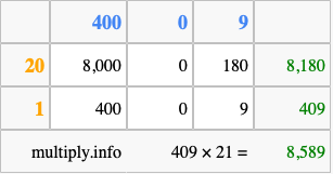 That's all there is to it! As you can see from the box above, the answer to 409 times 21 using the box method is 8,589.
