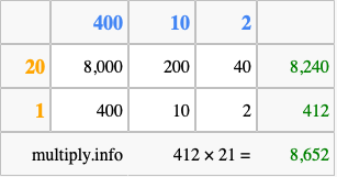 That's all there is to it! As you can see from the box above, the answer to 412 times 21 using the box method is 8,652.