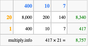 That's all there is to it! As you can see from the box above, the answer to 417 times 21 using the box method is 8,757.