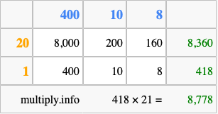 That's all there is to it! As you can see from the box above, the answer to 418 times 21 using the box method is 8,778.