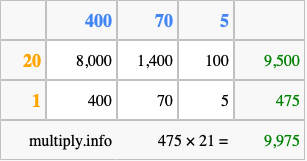 Finally, we add up all the sums we found in step 3 to get our final answer to 475 times 21.