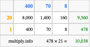 Finally, we add up all the sums we found in step 3 to get our final answer to 478 times 21.