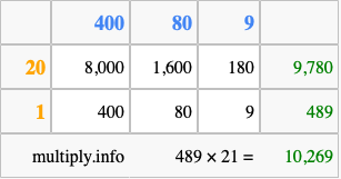 Finally, we add up all the sums we found in step 3 to get our final answer to 489 times 21.