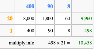 Finally, we add up all the sums we found in step 3 to get our final answer to 498 times 21.