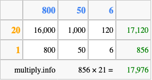 Finally, we add up all the sums we found in step 3 to get our final answer to 856 times 21.