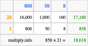 Finally, we add up all the sums we found in step 3 to get our final answer to 858 times 21.