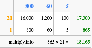 Finally, we add up all the sums we found in step 3 to get our final answer to 865 times 21.
