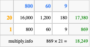 Finally, we add up all the sums we found in step 3 to get our final answer to 869 times 21.