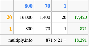 That's all there is to it! As you can see from the box above, the answer to 871 times 21 using the box method is 18,291.