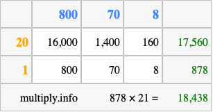 Finally, we add up all the sums we found in step 3 to get our final answer to 878 times 21.