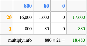 That's all there is to it! As you can see from the box above, the answer to 880 times 21 using the box method is 18,480.