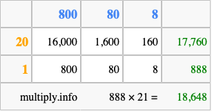 Finally, we add up all the sums we found in step 3 to get our final answer to 888 times 21.