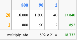 Finally, we add up all the sums we found in step 3 to get our final answer to 892 times 21.