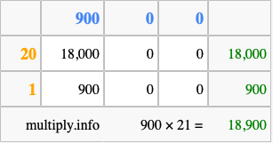 That's all there is to it! As you can see from the box above, the answer to 900 times 21 using the box method is 18,900.