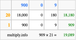 Below is an illustration showing you how to calculate 909 times 21 using the box method, using the instructions above.