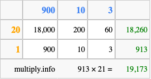 Below is an illustration showing you how to calculate 913 times 21 using the box method, using the instructions above.