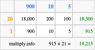 Below is an illustration showing you how to calculate 915 times 21 using the box method, using the instructions above.
