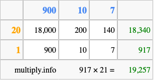 Finally, we add up all the sums we found in step 3 to get our final answer to 917 times 21.