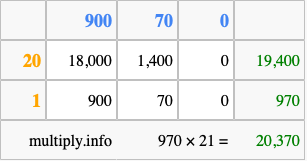 Below is an illustration showing you how to calculate 970 times 21 using the box method, using the instructions above.