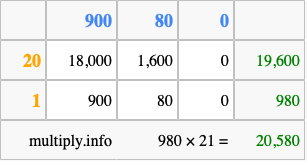 Finally, we add up all the sums we found in step 3 to get our final answer to 980 times 21.