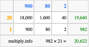 Finally, we add up all the sums we found in step 3 to get our final answer to 982 times 21.