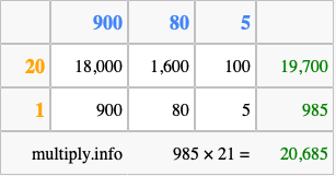 Finally, we add up all the sums we found in step 3 to get our final answer to 985 times 21.