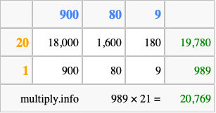 That's all there is to it! As you can see from the box above, the answer to 989 times 21 using the box method is 20,769.