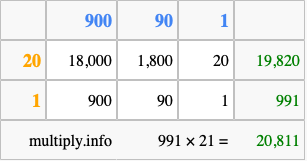 Below is an illustration showing you how to calculate 991 times 21 using the box method, using the instructions above.