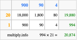 Finally, we add up all the sums we found in step 3 to get our final answer to 994 times 21.