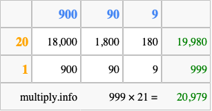 That's all there is to it! As you can see from the box above, the answer to 999 times 21 using the box method is 20,979.