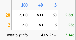 That's all there is to it! As you can see from the box above, the answer to 143 times 22 using the box method is 3,146.