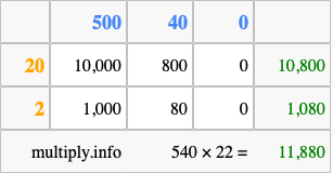 That's all there is to it! As you can see from the box above, the answer to 540 times 22 using the box method is 11,880.