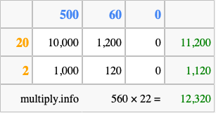 Finally, we add up all the sums we found in step 3 to get our final answer to 560 times 22.