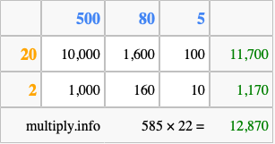 Finally, we add up all the sums we found in step 3 to get our final answer to 585 times 22.