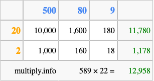 Finally, we add up all the sums we found in step 3 to get our final answer to 589 times 22.