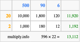 That's all there is to it! As you can see from the box above, the answer to 596 times 22 using the box method is 13,112.