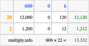 That's all there is to it! As you can see from the box above, the answer to 606 times 22 using the box method is 13,332.