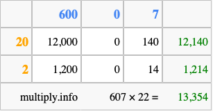 That's all there is to it! As you can see from the box above, the answer to 607 times 22 using the box method is 13,354.