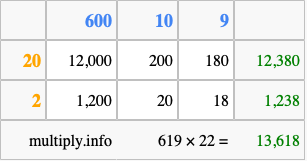 Finally, we add up all the sums we found in step 3 to get our final answer to 619 times 22.