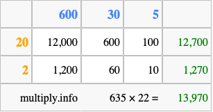 That's all there is to it! As you can see from the box above, the answer to 635 times 22 using the box method is 13,970.