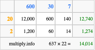 That's all there is to it! As you can see from the box above, the answer to 637 times 22 using the box method is 14,014.