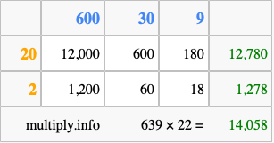 Below is an illustration showing you how to calculate 639 times 22 using the box method, using the instructions above.