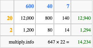 Below is an illustration showing you how to calculate 647 times 22 using the box method, using the instructions above.