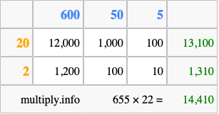 Finally, we add up all the sums we found in step 3 to get our final answer to 655 times 22.