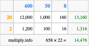 That's all there is to it! As you can see from the box above, the answer to 658 times 22 using the box method is 14,476.