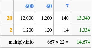 That's all there is to it! As you can see from the box above, the answer to 667 times 22 using the box method is 14,674.
