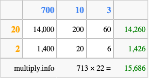Below is an illustration showing you how to calculate 713 times 22 using the box method, using the instructions above.