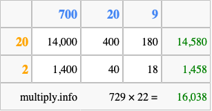 That's all there is to it! As you can see from the box above, the answer to 729 times 22 using the box method is 16,038.